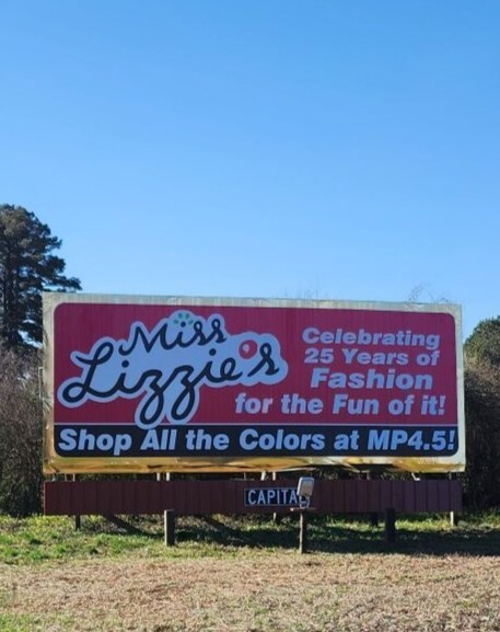 Our pink‑and‑gold billboard on Highway 158 marks a milestone — 25 years of color, joy, and coastal style at Miss Lizzie’s.